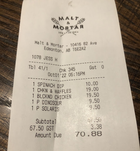 Read moreTried this place out as a spur of the moment decision as our group walked by. It seemed pretty empty for a Friday evening and now I know why. First of all, as many reviewers have pointed out, the waiting is ridiculous. The server got our drinks quickly enough, but then we waited 40 minutes for our food. Apparently there was some large party at the back of the room, and our orders were delayed because of it. Well, if you accept our business knowing you can't provide reasonable service, then you can expect some unhappy customers. Then when you bring out the blandest restaurant fare I've ever encountered, you deserve what you get, which is no tip. And the blandness cannot be overstated. I made the mistake of deciding not to purchase cheese and bacon for my burger, so I got unseasoned hamburger meat, cooked grey, with a pickle, tomato slice and lettuce. No condiments or sauce of any kind. Just cardboard food. This was accompanied by a teacup of unsalted, unseasoned shoestring fries and a thimble of ketchup. Were we all ordering from the diabetic menu by accident? Everyone in our group had disappointing meals, when they eventually arrived. Ironically, the burger was the last thing to arrive, a couple minutes after the rest of the meals. So then the manager comes over with the waitress, friendly and apologetic, to offer to comp our drinks. That was nice for the three out of four of us who actually ordered a drink. What about the fourth? Suffice to say, no tip, and boy did that waitress ever show her true colours when she saw no tip. The two of us who refused to tip got our receipts tossed on the table without a word, as she stormed off, only to come back a few minutes later, speeding by wordlessly to grab our plates, which still had food on them, right off the table from under our hands. This place needs a drastic overhaul in management, server, and...