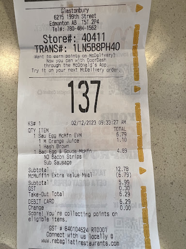 Horrible experience today, felt being blamed for a crying cashier. My wife and I always come to this Glastonbury store and most of our reward points always come from this store. We ordered breakfast today at around 9:30 am feb 12/23 after waiting in line for so long. A young lady took our order, we initially have over 20,000 points on the app and we wanted 2 meals as the app says we can have a free extra value meal for 10,000 points. So we gave the code and the cashier said it doesn’t work so she told us to refresh the app. When we refreshed the app 10,000 points were taken off without even placing an order yet but she said to place an order anyway. So we placed the first order as sausage and egg mcmuffin meal and wanted the second meal the same. The cashier said each reward claim must only be one transaction so the second meal has to be paid separately. So we paid for the first meal and just added an extra mcmuffin on the side and change the drink to OJ. After we paid the app took another 10,000 points and only about 207 pts remain on the app. We asked the cashier where the other 10k pts went as we only ordered 1 meal. The cashier kept explaining we cannot claim 10k twice so my wife explained that we are willing to do 2 transactions but we want to know what happened to the other 10k pts. The cashier did not seem to understand our concern so my wife asked the cashier to get the manager. A woman manager (with pink ponytail and eyeglasses) came and asked us the concern and we explained again that 20k pts was used instead of 10k for 1 extra value meal meaning we lost 10k for nothing. The manager took out her phone which I thought she was going to call customer service or try to return the points but then she asked us what the second meal is supposed to be and we ordered the same sausage and egg meal then she gave us a receipt and told us “here I used my own points” then walked away. I found it rude instead of helpful because to begin with NO APOLOGY. In addition they made it seem like we wanted free food. We just wanna know what happened to the 10k pts and just want it back, we are willing to pay. To make matters worse, when we finally got our order and sat down to eat the general manager (we just assume as he had no name tag and did not introduce himself properly) came to our table and immediately asked us what happenedd as their cashier is upset and crying. We explained again what happened to our points and the GM said it must be a glitch in the system and even himself loses points when using the app. However the GM said the extra sandwich and OJ must have affected the points on the app. My wife showed the GM the receipt where it shows we paid for the OJ upsize and the extra sandwich on full price only the sausage egg meal was free. My wife explained that it seemed like we were on the wrong because the cashier started crying. The GM said thats why he approached us just to know what happened. In the first place if they just explain properly there wouldn’t be an issue, of course we sounded upset as it didn’t seem like the staff understand our concerns or know what to do, they should be the expert of their own craft. But anyway made us feel horrible and lost our appetite, definitely did not enjoy our sunday breakfast! Our receipt # 137...