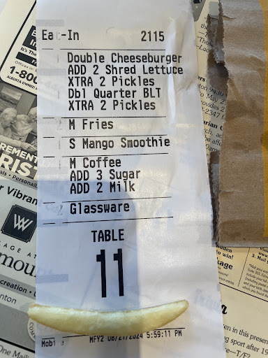 Not really sure what to say I really don't like writing bad reviews however I believe the cleanliness should massively be improved. Approx. 80% of the restaraunt was empty; there were a lot of empty tables but all of the tables were filthy. It was a massive turn off to want to sit down and enjoy a meal with crumbs, stains and dirty seats. I was afraid of our food touching the tray, I'm sure the trays were not cleaned. Our drink cups didn't have the right size lids stocked by the machine, I went and asked for some only to be smiled at and ignored while they were working behind the counter. After receiving our food, there were no napkins given to us, and when we went to get some by the dispenser it was also empty. I asked for some again from the counter and was told to grab some from the empty dispenser (I kindly advised them there were none). Food - well the cheese made it half way to the burger so that was good... my bun was missing a peice. I was so hungry I didn't want to bring it up and to be honest I didn't want to think about why the piece was missing. Ambience - not great. It is cold out so I fully respect establishments that allow people that may not have warmth to warm up - but at least if they respect your establishment and other patrons. There was a female yelling in the corner eating a giant bag of chips. I understand they are busy with drive though but I think you should have enough staff to clean, maintain and manage your establishment. Didn't feel very well after eating but that could have been from general concern of this meal and the establishment. Took about four hours for the food to propertly settle. We've been to this McDonalds many moons ago having lived down the road... you can definitely do better. Wishing you the...