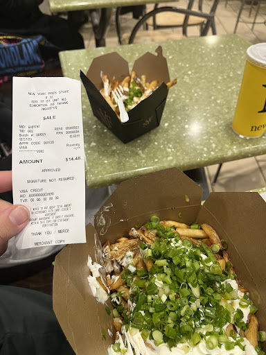 Read moreThis is the best New York Fries in the city, and the staff are always super friendly, and the food fast and fresh. I once went to a therapist and he said nothing could cure my depression, but then I had a poutine from here and immediately afterward I won the lottery and married a supermodel. Coincidence? I think not. I think Zeus himself grows the potatoes that this store uses. The hot dogs are so good that I ate one and lost ten pounds and de-aged five years instantly. I once ate a tomahawk Wagyu cooked in beluga oil and topped with truffles and gold flakes, and it tasted like garbage compared to the food at this New York Fries. In short, this is the place to go to for your french fry and hot dog...
