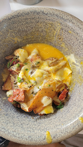 For myself I ordered the "Gold Digga" breakfast poutine which is made up of poached eggs, herb potatoes, Saint Cyrille curds, Berkshire roast pork, black truffles and brown butter hollandaise. To the staff's credit, I asked for my eggs soft and they confirmed that they would be runny. What I was not expecting once the meal arrived was firstly the smaller portion size and secondly that the mix of the egg yolks, whites, hollandaise sauce, oils and cheese would leave the bottom half of the bowl a symphonic mess of a soggy herb potatoe soup. This was contrasted with the overcooked Berkshire roast pork which more closely resembled last night's overcooked leftover steak cubed and refried for the next-day patron's. The seasoning was present but immediately overwhelmed by the soggy potatoe soup to be rendered pointless and the truffles were simply absent. All together the dish is worthy of a spot on Gordan Ramsay's Kitchen Nightmares and were it not for having spent time in the Army eating whatever we were told to eat, I'm sure I would have rejected this out of hand.