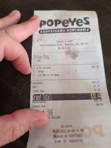 Read moreI ordered a 5 piece ghost pepper chicken and 8 piece spicy chicken only. The lady told me I couldn't order the 5, only 10 piece ghost pepper and no combo. I asked her why is it I can only order 10 and not 5? She wouldn't give me an answer. I wanted to try the ghost pepper wings as I dont pass by a popeyes often. So, I get the 10 ghost pepper wings and the 8 piece chicken. Total was just under $40, and she instructs me to park in the front. I waited 23 minutes for my order. Then the lady brings it out and again I ask her and she says she would have to call (as in dial) the manager. Ok so, I dont have all day as this is taking forever as it is, so I said forget it. I hit the road and drove 18 mins. I open my order, the 10 wings look good, nice and warm and crunchy. The 8 piece chicken is dark in color, soggy not crunchy at all, and I bite into a drumstick and it is as red as the day it was attatched to the rest of the chicken carcass. I am extremely disappointed as I was looking forward to having a great Popeyes experience with my family, and I'm patient enough to say, ok the 25 min wait was long, but this chicken is by no means cooked or edible. Can I post pics? Ok I got it. I got pictures. Why can't I post pics here??? What a waste, especially for the cost and and driving and time. I will not be going there ever again. Very saddened. They're gonna kill someone serving...
