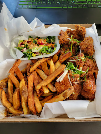 Read moreFor $16.25 I had 5 pieces of delicious fried chicken + 1 drink (water) + 1 side (Kimchi). Great tasting fried chicken. I really liked the Cilantro sauce on the side to dip/pour and the real cilantro on top. Fries were also good and Kimchi was on point. (FOOD: 5/5 Stars). / SERVICE: Lack of organization at the counter, pick-up drivers all over the place. A young girl with no welcome skills at the counter. No welcome, No Hi, No small talk. (1/5 Stars) I ordered at the front counter and picked-up there too and was automatically given the option at the POS to TIP 15%, 18%, 20% or more. Really? (1/5 Stars) The owner doesn't think their employees are worth more money? Shall I have to help give the employees a better wage? (1/5 Stars) I waited for some 10min which is fast (5/5 Stars). At the pick-up, my "new" name was "LYDL". Then the girl called my "new" name as "LION". lol (0/5 Stars). Some young workers don't seem to care to properly ask for their customer names? If I knew her name I would have said wrongly on purpose to put herself in my shoes? I don't do that but oh well. SPACE: 3/5 Stars: Nice painting on walls and pillars, nice seating and ample. Not noisy inside. Garbage bins were overflown inside. Bathroom was tidy. And a lack line/organization for pick-up drivers. Conclusions: Great and affordable food for 104 Street Downtown. Low quality Customer Service in my experience on Saturday afternoon. Demanding tips upfront when customers have to order and pick-up at the counter? No servers, right? So I shall tip minimum 15%? Only if my name wasn't written and called wrong twice and the counter girl was pleasant and had remembered to give me cutlery at the end but none. I still tipped them...