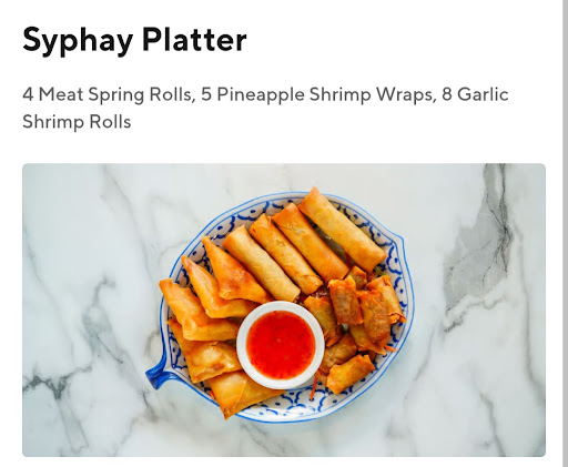 Read moreWe've ordered take out a few times but the last 2 have been a bit frustrating. The first time the order was never received by the restaurant so I did have to sit and wait while it was prepared. I assumed it was a one off and the gentleman who helped me was apologetic. The food is always great so it didn't deter us from ordering again. I ordered again yesterday (June 14). Initially the website told me 27-37 minutes for pick up. Then I got a text message stating nearly 90 minutes. So I called to ask as I had a deadline and the person who answered said the initial time was correct. No problem so I headed to the restaurant. I had specifically wanted the garlic shrimp bites which you are only able to order for takeout with the Syphay Platter. As per the website, that includes 4 spring rolls, 5 pineapple shrimp wraps, and 8 garlic shrimp wraps. Our order was ready approximately 10 minutes after the estimated time. Not a big deal. Then I get home and we unpack dinner to see that the platter ended up being 6 spring rolls and 2 salad rolls. None of the other times were included and we were not informed that it wasn't available or that a substitution was made. We didn't order the salad rolls on purpose. The food was good as usual but some work surrounding communication, how the online delivery systems work, and availability to provide pick up orders in a timely manner would definitely improve the rating. We've always had good service...