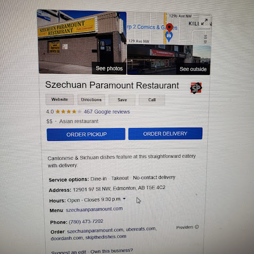 Read moreI did a search on Google for Szechuan Paramount Restaurant and on the right Google showed options to order dinners for 1 to 8. I clicked on Order Pick-up and then Dinner for 1 and then checked out. When I arrived I was told they only had a DoorDash order. After a lot of confusion that lasted about 10 minutes, I found out I paid an extra $3.00 to DoorDouche for ordering online and using a credit card, as well as losing the 10% off for pick up orders had I paid cash. This is after it said on the menu "No service fee." When I pointed this out the server said I should have called in my order and gave me a printed menu pointing out the lower price on the menu and the discount for paying cash for pick-up orders. I hate DoorDouche and have now made a formal complaint to the Alberta Consumer Investigations Unit for fraud. You (the restaurant owner who set up the system) can't say "no service fee" after raising the regular price of the item by $3.00! That is a service fee! Never mind the fact that I lost the 10% off had I paid in cash. Yes, I am angry with DoorDouche for allowing you to raise the fees for your products and then passing that same "service charge" onto customers who don't take the time to compare the regular cost of goods with the inflated cost, but rather click on Order Pick-up and believe the words "no service charge" which is not true. There was an added service charge of $3.00 added to the regular price of the dinner, thanks to DoorDouche taking my order and credit card number and then sending...