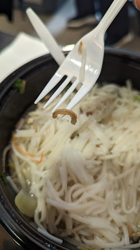 I have visited this location before and was satisfied however this last visit was less than pleasant. To start off, their 4-5 TV menus were not working and flashing an error screen the whole time I was there. I made an order for myself and some coworkers; 2 had ordered the Thai soup and both had these weird worm looking things in them (picture for ref). Both of them did not finish their lunch because it turned them off from eating. Another coworker had ordered the Banana Chocolate Cake but we did not receive it. I ordered the Yellow Curry, which is really the only thing I ever order from there and was super disappointed. The container was more than 2/3 rice and the amount of sauce barely covered the vegetables/meat and it definitely did not reach the mound of rice I was given. While waiting for my order to be prepared I used the washroom and if I didn't have to go that bad I would have waited the 20 minutes to get back to work. The smell was awful; it smelled of bad sewage and you could see water stains along the tiled floor and lip that goes up the wall. The sink and metal paper towel dispenser were covered in rust but at least they had soap and paper towels in them. I don't think I will return to this location again, which is sad because it's nearby to work and I usually love the Yellow Curry. The staff were very nice, I do want to make a...