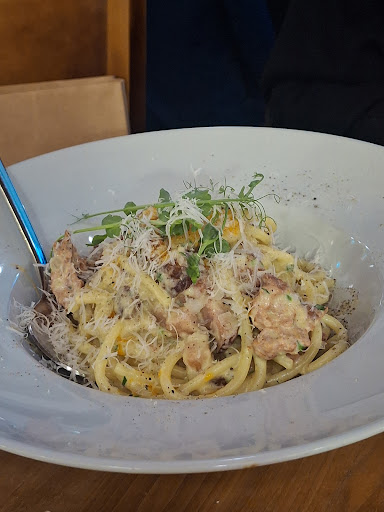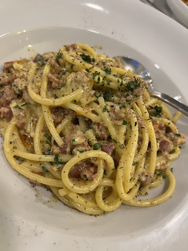 I purchased the carbonara. It was good, not great the way others have reviewed here. Price per portion was reasonable at $25. Our server asked if we wanted fresh cracked pepper. Our server never offered parmesan unless this is the only Italian restaurant in this price range that doesn’t offer it for the pasta, which again I found interesting, not that my dish needed it as the pancetta in the carbonara was very salty anyways. My friends liked their baked tortellini, they would have appreciated some parmesan on theirs.