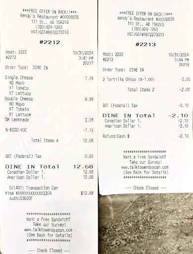 Here’s how I was overcharged: What I should’ve paid: $8.99 (Dave’s Double) + $1 (Lemonade offer) + $0.50 (tax) = $10.49 What I actually paid: $8.99 + $3.09 (full lemonade price) + $0.60 (tax) - $2.10 (refund) = $10.58 This results in a $0.09 overcharge.