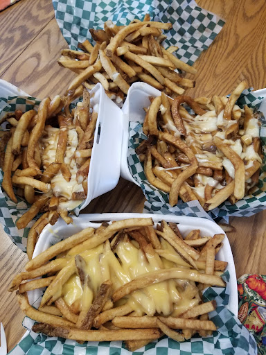 Read moreDamp, cool day in Espanola. Good day for poutine and fries. Located right on the main street through Espanola with lots of parking and bright, cheery tables. Lots on the menu to choose from. We had the small poutine and had cheesy fries. Large portions, tasty slightly smokey gravy, lots of curds. Because they put the chips, cheese, and gravy on both sides of the clam shell, and then close it up (held together with an elastic) the curds melt deliciously and get really stringy. Yum! The cheesy fries were an interesting change of pace. Did not taste like velveeta or cheez whizz. We'll be back. Not sure if I will try the onion ring...