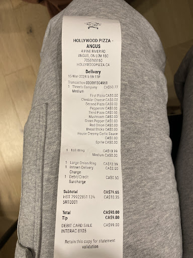 Well I live in Australia, and I have heard so many good things about Hollywood pizza in Angus. And I just couldn't resist myself so I travelled across the world from Australia to Toronto, to this pizza place! And oh boy was it worth it. The service was great, the pizza was outstanding and the overall experience was undescribable! I would 110% recommend this place to anyone in the world, because it was definitely worth the money for the travels, and I will be going soon again hopefully. If only I moved to Toronto 🤔 Thank you Hollywood pizza at Angus! 5...