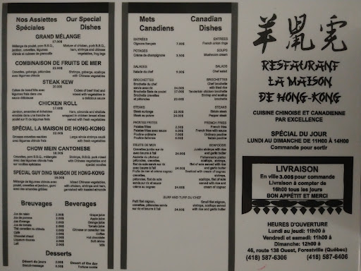 Read moreLa commande est arrivée et les mets étaient froid, les portions ont énormément diminué, il n'y pratiquement pas de viande dans les nouilles ni le chowmein, les frittes goûte toujours les mets chinois ! Il est grandement temps que le livreur est une boîte thermos dans la voiture pour garder la nourriture chaude, arrêter de faire les frittes dans la même huile que la nourriture chinoise, ajouter de la viande et des légumes à vos mets et surtout augmenter vos portions au moins d'un tiers sans en changer le prix, c'est de cette façon que vous allez quadruplé vos ventes, mais surtout revoyez l'assaisonnement pour redonner un peu plus de goût à vos plats, dire que ce restaurant à déjà été classé parmi les 10 meilleures restaurant chinois au Québec ! On en est rendu vraiment, mais vraiment plus là , on est même plus dans le top 100 au Québec... Faite de quoi et c'est URGENT !!! Je connais des gens qui étaient content de venir d'aussi loins que Montréal juste pour venir prendre un bon repas chez vous, et maintenant, il ne veulent plus rien savoir de votre...