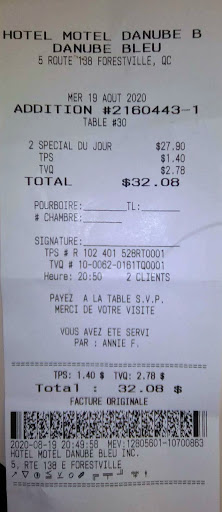 Souper en couple du 19 aoĂ»t 2020. Menu du jour trĂšs correct sinon le reste est trop cher. Nous avons pris deux spĂ©ciaux du jour Ă $13.95 donc avec soupe, dessert thĂ© ou cafĂ©. CâĂ©tait comme une sorte de coquille Saint-Jacques sans patates et câĂ©tait excellent. La soupe et le dessert Ă©taient Ă©galement satisfaisants. Service trĂšs lent pour finalement se faire dire « allo, je suis avec vous ». Nous avons travaillĂ© intensĂ©ment sur notre patience. Nous Ă©tions assis Ă lâĂ©cart et nous croyons que dâavoir changĂ© de place en voyant quâune banquette sâĂ©tait libĂ©rĂ©e, a aidĂ© notre cause de joyeux affamĂ©s. Nous Ă©tions en contexte covid-19. Le restaurant fermait Ă 22 heures. Nous avons Ă©tĂ© correctement servis par Annie F. malgrĂ© notre longue attente avant quâelle vienne Ă notre table pour nous donner signe de vie. Total de $32.08 avec taxes pour un grand total de $36.58 avec le pourboire. Nous avons 9 photos Ă vous proposer. Nous recommandons ce restaurant.