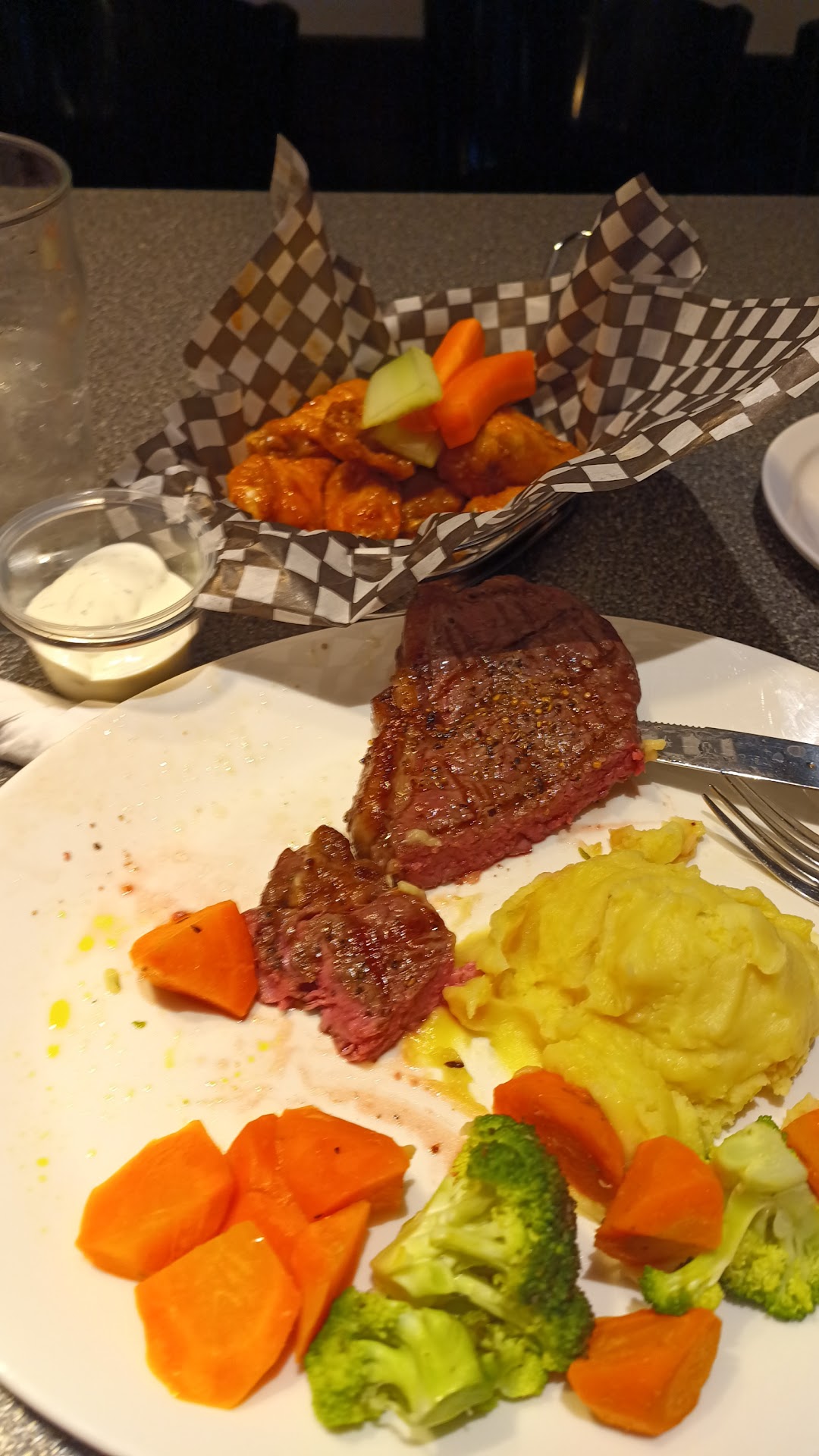 Read moreDecent service, not great food. I ordered wings as an appetizer and a steak. The steak came out quickly after eating only two wings and was akin to subpar camp food. Veggies served with the 36 dollar steak were steamed carrots and broccoli that looked as if they were from a frozen Costco bag. Potatoes were subpar and had the consistency of instant mashed potatoes, steak was decent enough. Honey hot wings were good and had decent proportions. For just the two items, no drinks, the bill came out to 56 dollars. Anna was a great server though. If you want food to remind you of an old camp cutting corners and costs this is the...