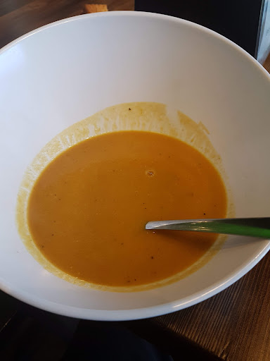 Cut to walking into the restaurant, I was greeted by a friendly looking guy behind the counter who was able to guide me through the ordering process. I ended up with what amounted to a bucket of salad and a really big soup. Be warned, dear reader when they say large, they mean large. The soup was some kind of Thai concoction with a pleasant curry flavour. It was smooth and hot. It even came with croutons, but I'm not supposed to eat those because flour is carb, carb is sugar. I ate them anyway.