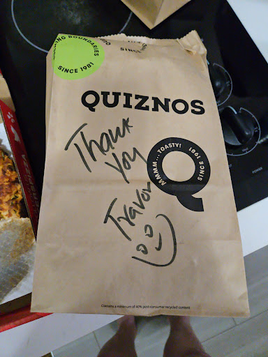 Ā Ā Ā Read moreI'm really sad I have to share this experience because I know Quiznos does so much for this community. I ordered a bowl of soup and a small sandwich yesterday only for my food to be Iced cold when trying to eat it. I'm not picky so I packed it up, took it home and at home decided I'd warm it up tomorrow for lunch and try again. I don't know what exactly is going on, particularly with the soup, but it would not get warm, not anywhere close to hot. Despite my negative experience I still do appreciate their community outreach and thus will come back again, but maybe not...
