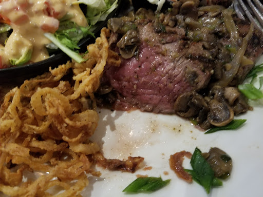 it wasn’t for your damn good of a server/bartender I probably wouldn’t have even accepted the re-fire on my order. Came in for a solo dinner cause I’m here for work, ordered the 10oz steak with potato smashers. Service was quick and attentive - I could see the server was also the bartender and had a pretty significant amount of tables So that being said, Service was pretty amazing given the circumstances. Here’s where it went bad, the potato whatever’s had zero seasoning in them and literally just tasted like bland potatoes with a blanket of melted cheese - wouldn’t get those again - my steak which I ordered medium rare came out well done. I cut the steak in multiple spots to confirm this - showed it to my server and he immediately took action and offer a fresh one to the doneness that I ordered originally. Mind you this was already 30+ minutes from the time I ordered so I’m pretty hungry at this point, new steak came out in under 10 medium rare; the quality of the steak was subpar, most pieces I couldn’t chew down and just ended up swallowing (pause no diddy) making this meal a pretty miserable and sad one, I don’t think I’ll ever be able to emotionally recover from this...