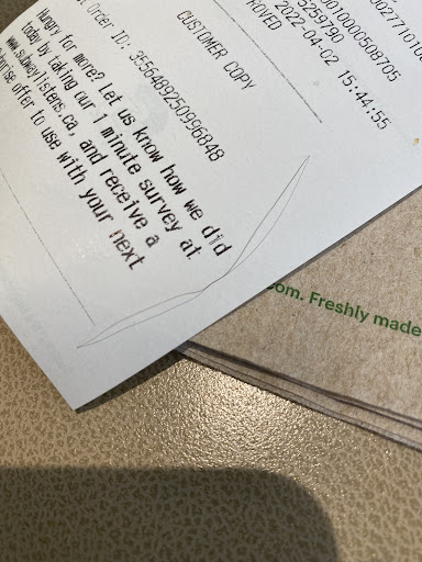 Read moreThe absolute worst customer service I have ever experienced at a Subway. Ordered online for pickup, and all 4 subs were made incorrectly when we got home and opened them up. Some excuse that they had no chicken, so made us a club instead. Next visit and excuse, we have no ham! Kid goes on to describe how he is not allowed to prep any ham 30 minutes before close because he has to fold all the pieces and fill a container. If you want consistent quality and experience, go to Prospect St.....do not waste...