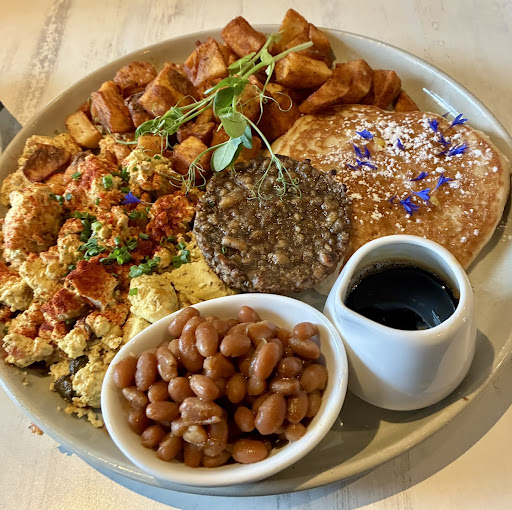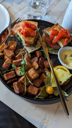 Bad Stuff: We waited over an hour for our food, there was no communication or apology for the long wait from staff. If there is going to be a long delay, we would have appreciated if this was communicated to us. Service, while friendly, was very slow and inattentive leaving us feeling neglected. It was difficult to get their attention for basics, such as a water refill so we asked for a pitcher of water so we could do it ourselves, which we were not given. The food was overall, not the best. The food was "pretty" but lacked flavor and care. Most of our dishes appeared to be left waiting under the heat lamp as the "butter" ball on the "chicken" and waffles had completely melted, sauces had congealed, decorative vegetables/flowers wilted and fried things such as the "chicken" and potatoes were stale. Flavors were very bland and lacking a much needed savoury flavor. Gravy had no flavor, but helped with the "chicken" and potatoes as they were stale/dry.