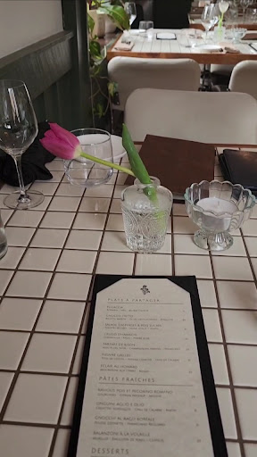 We sat at the bar & experienced the 4 course valentine’s dinner menu. It was such an array of different flavours yet each dish came to the perfect balance. The focaccia bread had the most divine smell coming out of the kitchen, paired w/ the butter made with beet puree and lemon… so delicious! The scallops were creamy and herby - balance of comforting yet fresh. The goat cheese with maple caramelized onions … so savoury. The lobster linguini was amazing, silky and creamy, the pasta was fresh! The dessert was a pear puff pastry with a vanilla gelato (loved) & an olive oil cake with a dark chocolate mousse (only thing that i thought was just okay)