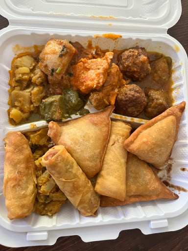 Butter chicken, chicken curry, beef kofta (meatballs), chicken tikka, chana masala, saag paneer, aloo gobi, rice. There were also eggrolls and samosas. 3 types of sauces.