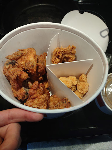 Ordered from here through Uber. 10 peice chicken bucket arrived FULL of grease soaking through bucket and paperbag. All chicken peices are burnt and full of brownish reddish oil. Sandwich had so much mayo ouzzing through and soggy bun. I tried to call 3x no answer. Reported to uber.