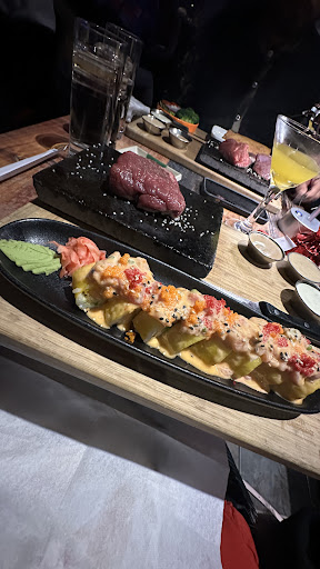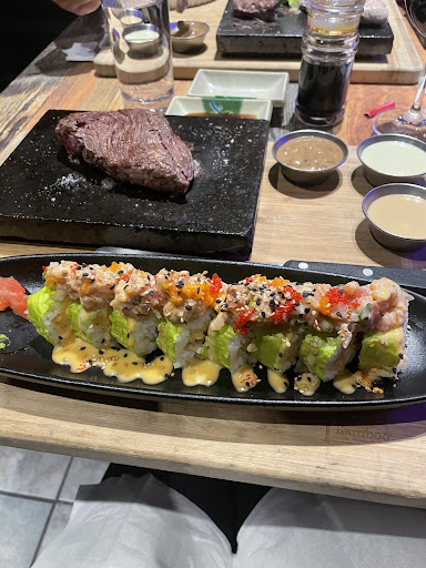 Les crevettes tempura, pas maison selon le serveur, étaient bonne somme toute. Les rouleaux nous ont beaucoup surpris ! C'était vraiment bon! Même si je suis assez certaine que la purée n'est pas maison. Les sauces étaient parfaites et la viande sublime! Elle me semblait que légèrement assaisonné pourtant elle était tendre et goûteuse! À part le manque de légumes, c'était débile ! Par contre, mon plateau de sushis m'a complètement déçu ! J'estime, selon mon expérience comme chef sushi, que 2 rouleaux sur 5 valaient peut-être 18$. Les trois autres proposaient peu de complexité et des ingrédients entrée de gamme. Un avec une petite tranche de saumon fumé, un peu de fromage à la crème et un avocat.... Un avec crevette et goberge... Un dragon eye, sushis de carottes avec une grosse echalotte au centre. Bien qu'il soient frit ce sushis ne vaut pas 18$! Chez mon ancien patron nous donnions ce rouleaux en gratuité après 30$ d'achat Ah ah! Leur pizza sushis m'aurait fait vraiment plus plaisir! Un seul rouleau de poisson cru dans tout le plateau et c'était le rouleaux qu'ils donnent habituellement en accompagnement dans loption steak et sushi. Il était très bon et généreux.