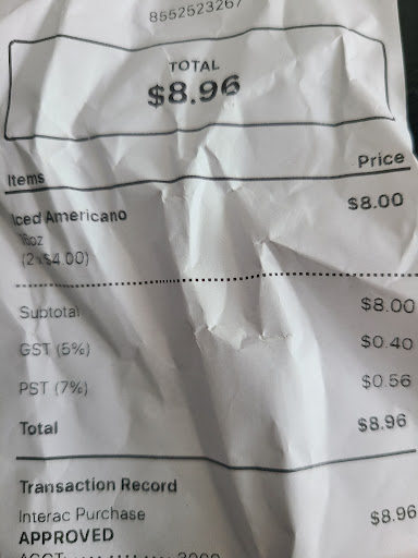 Read moreFirst of all, the service today wasn't the best from the blonde woman who was working there. I ordered 2 iced americanos and I pressed "no tip" option and the barista became unfriendly. So customers are supposed to tip people who pour coffee into a cup now? She used tap water for our americanos. And there are discrepancies amongst their online prices from what they charge you in stores. I ordered 2 x 16 oz Americanos, should be $3.75 each +0.25 for ice, so $4.00 + tax, should be $4.20 each, but why is my bill $8.96? When did coffee shops charge PST? Some kind of dishonest tactic for tourists?
