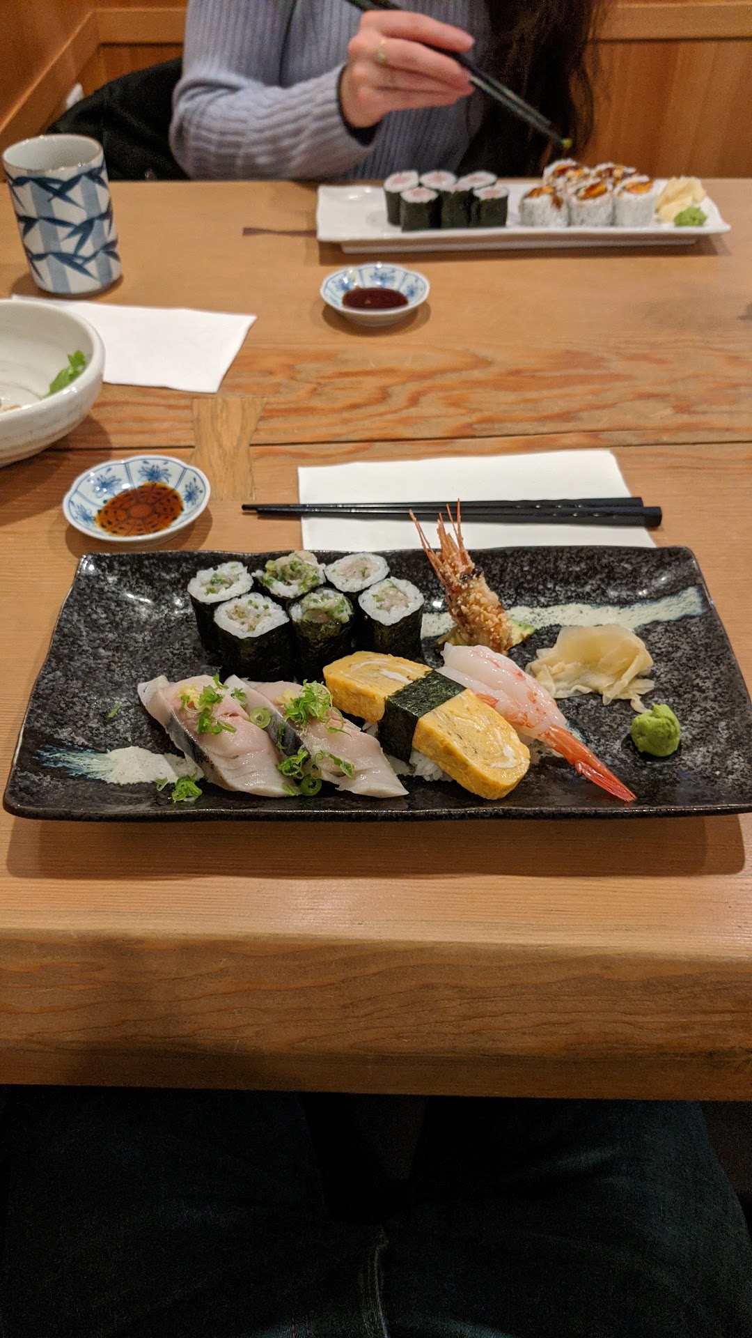 Read moreBased on the previous reviews, we were not disappointed.It's a lovely setting incorporating lots of natural wood from the tables, walls and decorations while remaining airy and light. We were greeted and seated right away - good timing on our part but it is the shoulder season and mid-week. The server was very friendly without hovering or being overly chatty. We ordered our usual vegetarian choices like spinach goma-ae, agedashi tofu, avocado roll , crunch yam roll and cucumber roll along with their veggie Caterpillar roll. At times you can get cheaper sushi when the rolls are mostly rice and the rolls are so loosely rolled they fall apart the moment you pick them up but that's not the case here. They strike a good ration of ingredients to rice and each piece stays together when picked up.. We could have ordered more as the menu had quite a few vegetarian options but we didn't want to overstuff ourselves. What we ordered was just enough. A great menu selection for a la carte or set dinners. Will be back the next time we're on the...