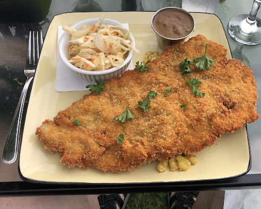 A hidden gem!!! No really... this place is hidden...down from the top of the hill near the main drag in Goderich and along a winding little roadway, you drive through an old stone tunnel that opens up to this modest looking little restaurant that is anything but modest when it comes to delicious food, and warm welcoming service. Is the atmosphere modern and high end....no... were we comfortable and had a great view... absolutely... A very cool menu cover opens up to a diverse selection of options to satisfy the whole family with some Eastern/central European favourites that caught my attention....My wife and son went with the seared salmon where I opted for the classic schnitzel....We were all completely satisfied with our meals from the salmon which was buttery, cooked to perfection (that a lot of places screw up) to my extra crispy full of flavour schnitzel on a bed of crispy yet soft spätzle...washed down with a cold Czech Pilsner and a classic gin martini... I was in a very happy place!! But that didn't stop my son from ordering the decadent River fritter... or I think we accidentally called it the River tail... no idea why... but it was delicious!!