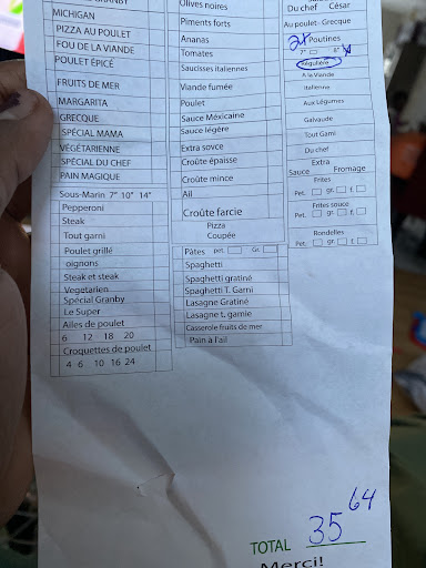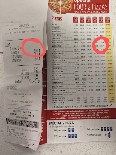 Service médiocre. Après avoir passé notre commande téléphonique pour une livraison, nous avons reçu nos deux pizzas 18 po. C'est seulement après le départ du livreur que nous avons remarqué une erreur de prix. Nous avons donc appelé afin de comprendre l'erreur et voir ce qui leur était possible de faire comme compensation. C'est le gérant qui nous a fait comprendre que leur menu distribué dans toute la ville contenait un erreur de prix sur les pizzas 18 po québécoise de 18$. Malgré que nous avons expliqué qu'il nous était impossible de savoir que ce n'était pas le bon prix sur leur dépliant (puisque nous n'avons pas reçu cette information non plus lorsque nous avons appelé pour prendre notre commande), ce gérant nous a dit que c'était évident que c'était une erreur et que nous aurions dû le savoir. Aucunement réceptif aux clients et impossible d'obtenir une compensation pour leur erreur, nous avons raccroché. Ensuite, nous avons remarqué qu'il y avait également une erreur sur l'une de nos pizzas. Nous avions demandé un extra bacon (qui nous a été chargé), mais malheureusement, aucun bacon sur cette pizza. Nous avons alors rappelé le restaurant et on nous a demandé une preuve en envoyant une photo de la pizza. On nous a fait sentir comme des menteurs. Ils ont finalement accepté de nous faire un crédit de 7,48$ après réception de cette dite preuve. Il est certain que nous utiliserons ce crédit sur une minuscule commande et que nous n'y retournerons plus jamais. Malheureusement pour eux, ils ont perdus pour un total de...