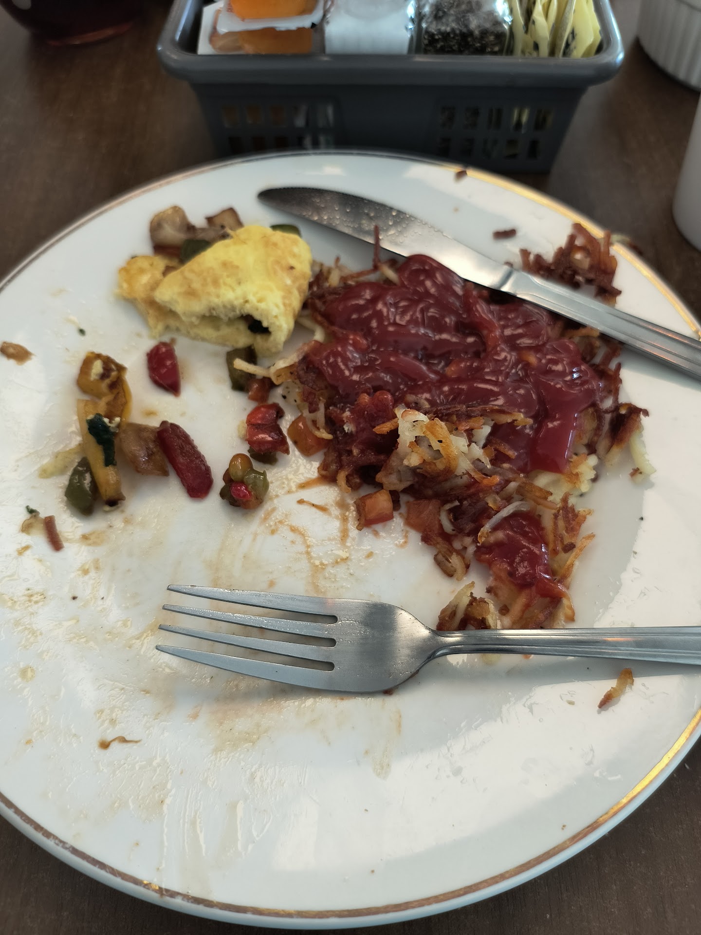 My entire meal; sunnyside eggs, bacon, hasbrowns, toast and crepes were perfectly cooked and hot when they came to my table.