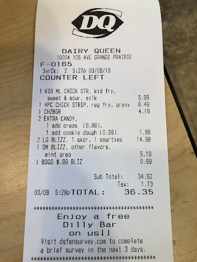 Read moreI have always bought my blizzard at this store at least twice a week from drive thru, and decided to walk into the store this time. I went into the store to buy ice cream, only for me to stand there for over 10mins and no one even said hello or acknowledged that I was there. There were at least 5 people in the store with two working towards drive thru window and two at the meal prep station. One of the workers walked right in front of me twice and came back the third time and picked a mop and ignored me with a frown and started mopping the floor. It was about an hour to closing and I was the only one standing at the counter, and other customers were sitting down, talking and having their meal. After waiting for 10-15 mins with no acknowledgement from the workers, I walked away disappointed and never coming back. At least a hello, I will be right with you would have been better. Poor customer service. I...