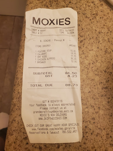 Read moreHORRIBLE experience from a server in the lounge this afternoon, she was very unprofessional, unclean and unfriendly. When we first came in and sat down there were already unhappy customers getting their food packed up to go because they were so upset with their server, they didn’t even want to stay and eat their meal. We originally planned on eating here but it took forever to even order and receive our drinks and even then did not get what we asked for, she dropped my straw on the floor and didn’t even get another one, I had to get up and ask for one. Then charged us the wrong amount and argued it VERY rudely, all to find out she was In the wrong and asked the bartender to come and deal with us because she didn’t want to come back to our table and admit she was wrong. It was not busy in there and there were several empty dirty tables that were left that way the entire time of us being here. We were absolutely blown away with how poor the service was, we decided to go somewhere else and eat and had a much better experience with excellent service. Definitely will not be going back to Moxies in the future and do not recommend wasting...