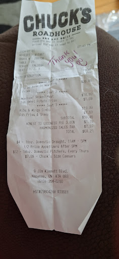 What is it about this location? It could give Chuck’s Roadhouse a bad reputation. We used to go to the one in Pickering and it was great. Food was consistently good. It was one of our “go to”, restaurants. We recently moved to the Napanee area and were thrilled to see a Chuck’s in town. Well the thrill was out the window once we decided to dine there. All the negative reviews are bang on. For some reason, this location does not know how to cook a steak properly. I requested medium, and I got well done…sorry, correction…shoe leather. It was not edible. It had also curled up on the sides. So the usual options were offered. Either they would cook me another one, while my husband sits and watches me eat, or it comes off the bill. I had only taken two bites when I said to my husband that I couldn’t eat it. It is not often I don’t eat a steak, even if it is slightly off, either way…to well done or medium. Couldn’t do it. It was so incredibly dry it just wasn’t edible. It had two of the toothpick stakes in it that both said, “medium well”. Meanwhile I had ordered, medium. Our server, Taylor, noticed how dry it was and apologized. That is when she offered to have another cooked or take it off the bill. I chose to have it taken off the bill. She took my plate to the kitchen. Moments later, someone that claimed to be the manager came to our table and said she understood there was a problem with the meal. I told her about my steak and also mentioned the toothpicks in my steak that both said, “medium well”, and I had ordered medium, but my steak did not even resemble medium or medium well. She said two of the medium well toothpicks mean, medium….like I was supposed to know that. Ok then. She got the story and just walked away from our table. Once again, ok, then. No apology…nothing. Not even what the game plan was, to resolve this. The server was far more professional and apologetic than the manager. She could take some tips from the server. We get our bill and she had taken 2 apps, half off the bill. Wow. Really? How about comping the meal? That was the impression our server gave us. After my husband begrudgingly paid, we were walking out to our car. I had to go back and speak with the manager again. It didn’t sit right with me, the way it was handled. I requested to speak to her and could see her bartending. She came over and said, we meet again. I explained that we were under the impression my meal would be comped. She mentioned the half price apps she gave us and said that should suffice. She claimed that I didn’t give them any other option, like it was my fault. ???? I guess she meant that I wasn’t willing to sit and wait for them to screw up another steak for me to eat, while my husband curls up on the booth seat and has a nap. Wow!!!!!! I then asked her if she was really the manager. She definitely wasn’t behaving like one. Very unprofessional and unsophisticated. She just starts to walk away from me and I say that I can’t wait to write a review. She throws her head over her shoulder and shouts, my name is Sarah, for your review. I would pretty well bet her name isn’t Sarah as she was so willing to give it to me, without me asking. Her unprofessionalism definitely reflects on this location. It’s a shame they would hire someone that lacks all CS and managerial skills, to deal with their customers. It really speaks volumes about this particular location. I guess they didn’t accept her application as a Walmart greeter. They have standards. A shame this restaurant is horrible as there aren’t too many sit down restaurant options for Napanee. The Belleville location is amazing….busy but amazing. I guess we should’ve been tipped off when we walked into the Napanee location and you could hear crickets. If they continue hiring incompetent managers, and inexperienced cooks, they will lose a lot of business, if not close down. Ps….save your useless default response. You obviously could care less as all the negative reviews speak for themselves. Nothing has come from all of the negative reviews, saying the same...