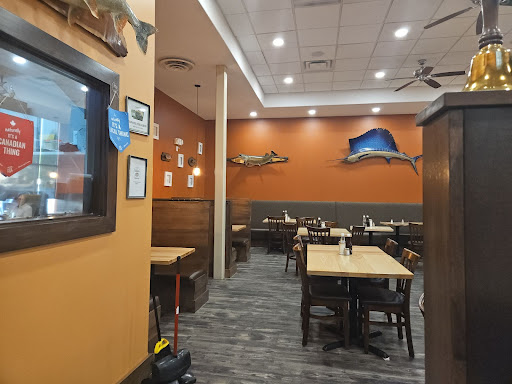 The ambiance is simple but nice, clean and appropriate - big, beautiful stuffed marlin and other fish on the walls. A nice mixture of booths and tables. Fabulous high ceilings. Different sized tables, and not on top of one another. We went for a late lunch on Sunday (one of the few places actually opened on a Sunday!), around 2:30 p.m., and there were a few other tables occupied. We were encouraged to sit where we liked (not forced to sit in the same area as others for ease of service). There are large booths with reserved signs on them, held for larger groups if needed (would fit 8 easily). We were only 2, and as one of them was our preferred location, we asked if they mineded if we did sit in one, and they let us take a big booth, which was very kind. First time there, and we had to have fish and chips (but note, the menu has ample offerings - definitely something for everyone here!!). The Haddock was fantastic!! Huge portions (of everything). 2 big, lightly coated (perfect consistency and flavour), thick, and fresh, beautifully white pieces of fish. Nice and light in flavour - not "fishy". Great fries - worth the splurge. And the Greek salad too was incredible- loads of feta and other ingredients (they didn't skimp). At $20.99 it might seem a little on the expensive side for fish and chips but, worth it - one plate could have been shared by 2 most certainly, but we were able to share our different sides and got a nice, recyable take-away container to put our leftovers in (enough for another meal!). A lovely tasting tartar sauce accompanied the fish. They have white and malt vinegar bottles, and S&P already on the tables. And their house wine was a nice compliment to the fish - Peller (ON) Sauvignon Blanc, and at $5.99 for a 5oz glass, we had to! (And their litre option was $15.99! Amazing prices). The server was kind, and the food didn't take too long to come. I hear they are under new management, so if you have been before and didn't have a good experience, I'd highlybrecommend you give them another try. Our first time there, and we will...
