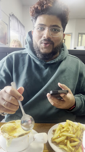 My friend, who is a vegetarian, had limited options to choose from, but he decided to go with the veg option. He ended up getting a French onion soup and a plate of fries, which were both delicious. Although the veg options were limited, we were both satisfied with our meals.