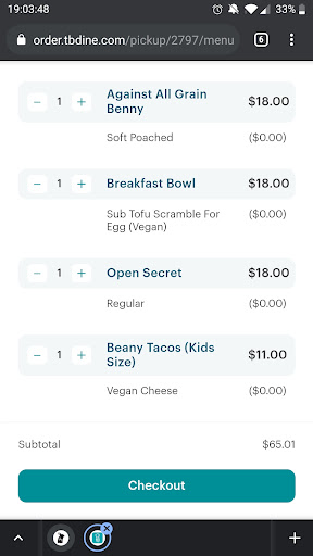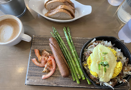 To start, we ordered the coconut chai and a cacao matcha drink. The cups were small and the drinks were a tad lacking for $7.50-$8 each. For food, we ordered the matcha pancakes with chocolate ganache and the scrambled eggs with hash browns, vegan sausage and toast (with eggs, not tofu.) When the scrambled egg dish arrived, nearly all the hash browns were burnt: they were black and inedible. Additionally, the eggs were tofu, not eggs and also burnt. In other restaurants you get jams/jellies on the side for your toast; that was not the case here. The matcha pancake dish was OK, but it is served with frozen blueberries, not fresh which is a bit disappointing. However, the chocolate ganache was excellent. The syrup they serve (if you ask) is good as well.