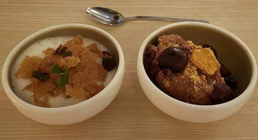 The desserts were the almond creme and the chocolate semi freedo. The chocolate was a really cool texture, fluffy, creamy, and yet heavy. It was a little overwhelming with all ita toppings bur it was made better by how much I didn't like the almond creme. It shouldn't have cream in the title. It's a foam and it's a slushy. Very much antithetical to cream. It tasted like odd cereal with its foam and its crunchy almond flakes.