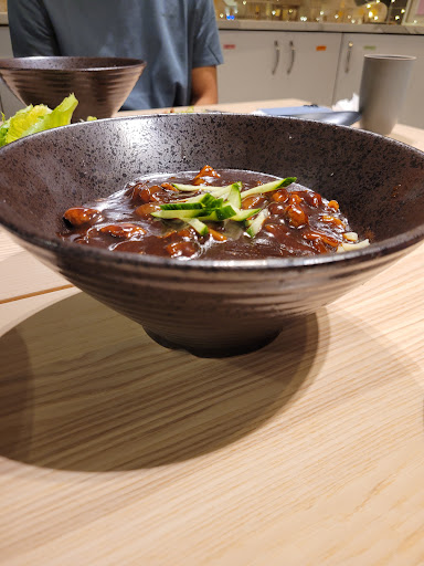 The food, which I'm disappointed to say, was mediocre. I ordered the black bean noodles to test how the food was. It tasted like the ones from a package you would get from the grocery store that you can then make at home. It didn't taste like jjajangmyun at all. There was no fiery taste you would normally get either. It pork was a bit tough so it seemed like it was cooked separately and mixed into the sauce. The texture of the noodles were good, but like I said, the overall dish was bland.