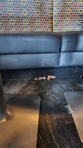 Lastly when we were getting ready to leave, my youngest went to pick up an item she dropped, the attached picture is what we found mushed into the bench seat under the table.