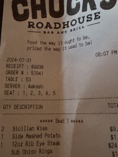 Read moreWas very mediocre. I can't blame the server but the restaurant was unprepared for the Labour Day crowd. We were a party of two. We came at the end of the dinner rush. Had a drink at the bar. I had a beer on tap, not an exciting line up, I had a Bud Light 18oz and she had an 18oz Cesar. The Ceasar she said was flavorful and it was only $7, the beer was $6. Cheap start for drinks. Our table took about 15-20 minutes. We had turned down booths as we preferred a table, we knew we'd wait a bit longer. Most of the seating is pub height tables and chairs followed by booths and very limited freestanding tables. We ordered the Chuck size Ceasar salad and it came with garlic flatbread. It was reasonably priced at around $12. She wanted to split the regular size Ceasar salad as she usually fills up on appetizers and doesn't eat her whole main. Glad we got the sharable size. It wasn't that big but it was decent for two. We had a couple more drinks, Moscow Mule $6 and a 30oz Canadian $8 as they ran out of Bud Light and Budweiser. She had Top Sirloin (medium) 7oz and lobster tail for $25 and I had the Ribeye steak (medium rare) for $25 both with just the regular sides of fries and corn. The medium steak was cooked properly but the Ribeye was medium edging on medium well. They advertise as having AAA grade steaks. I think the rating is debatable. The steaks were both over seasoned. I didn't expect a high quality steakhouse, after all it is Crabby Joe's rebranded as Chuck's Roadhouse. Anyways, steaks that are over seasoned are generally of lower quality. The final bill came to under $120 with gratuity. It wasn't anything special, it was just okay at best. The server was very personable and as attentive as she could be as she appeared to be managing more tables than I'd normally see in a restaurant. Overall, it wasn't a restaurant I'd return to. Yes there's something for everybody, a very diverse menu. Sometimes that isn't a good sign. It didn't appear that anything was a Chuck's Roadhouse specialty. Nothing they do better than others'. Just mediocre at best, honestly a little less than mediocre. That's why I gave it two stars. The server was trying it's just that the food overall was nothing better than you could do at home in a grill...