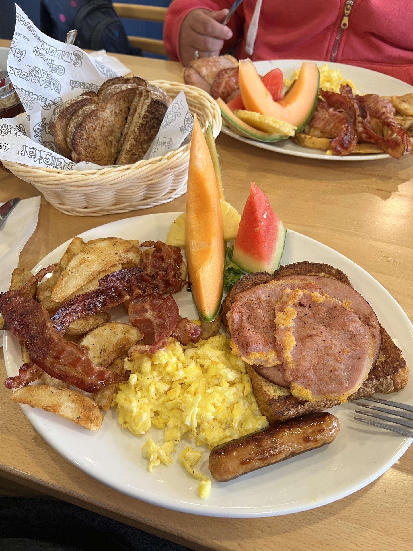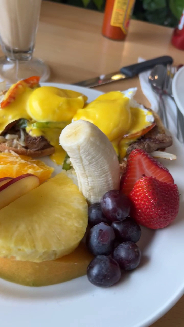As for the food it's definitely very good, I had the 2 eggs meal with toast, bacon, and potatoes with cheese(wedges), served with fruit garnish (watermelon, pineapple, and cantaloupe). Not a single aspect of the meal wasn't good it was all fantastic.