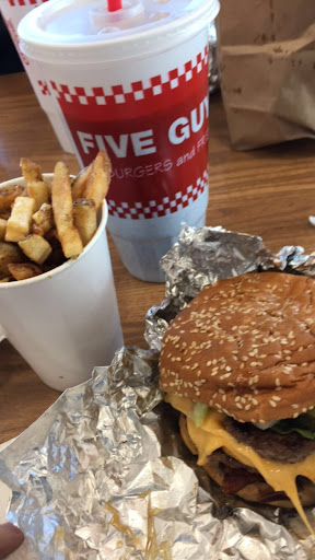 The cook squats the burger down which removes all the juices from the meat and on top of it he keeps cutting into it to see if it's cooked. The bun was cold but the condiments are free... the fries are cooked in peanut oil which should be mention by the cashier or better advertised then a board way back where they're cooking... ( some people are allergic to nuts and don't know or notice this until after they paid). Floors were quite dirty with food and feel greasy. This will not be a second stop. Franchise really needs to look at improving things here. If you seen one place, probably the same at other five guys.