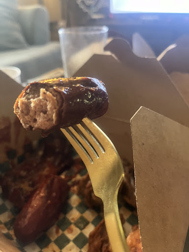 Sausage: this in my opinion had to be the best meat on the whole platter it had a somewhat decent flavour with the slightest amount of crisp and texture on the outside and a decently soft interior I still would never order again as it was covered completely in whatever that ketchup sauce is although not being disgusting and inedible like the first three things I had tried I would still never order again and I believe the reason I didn’t mind it was because of the first three things I tried this was in comparison much better but still lacking a severe amount of seasoning & Smokey flavour