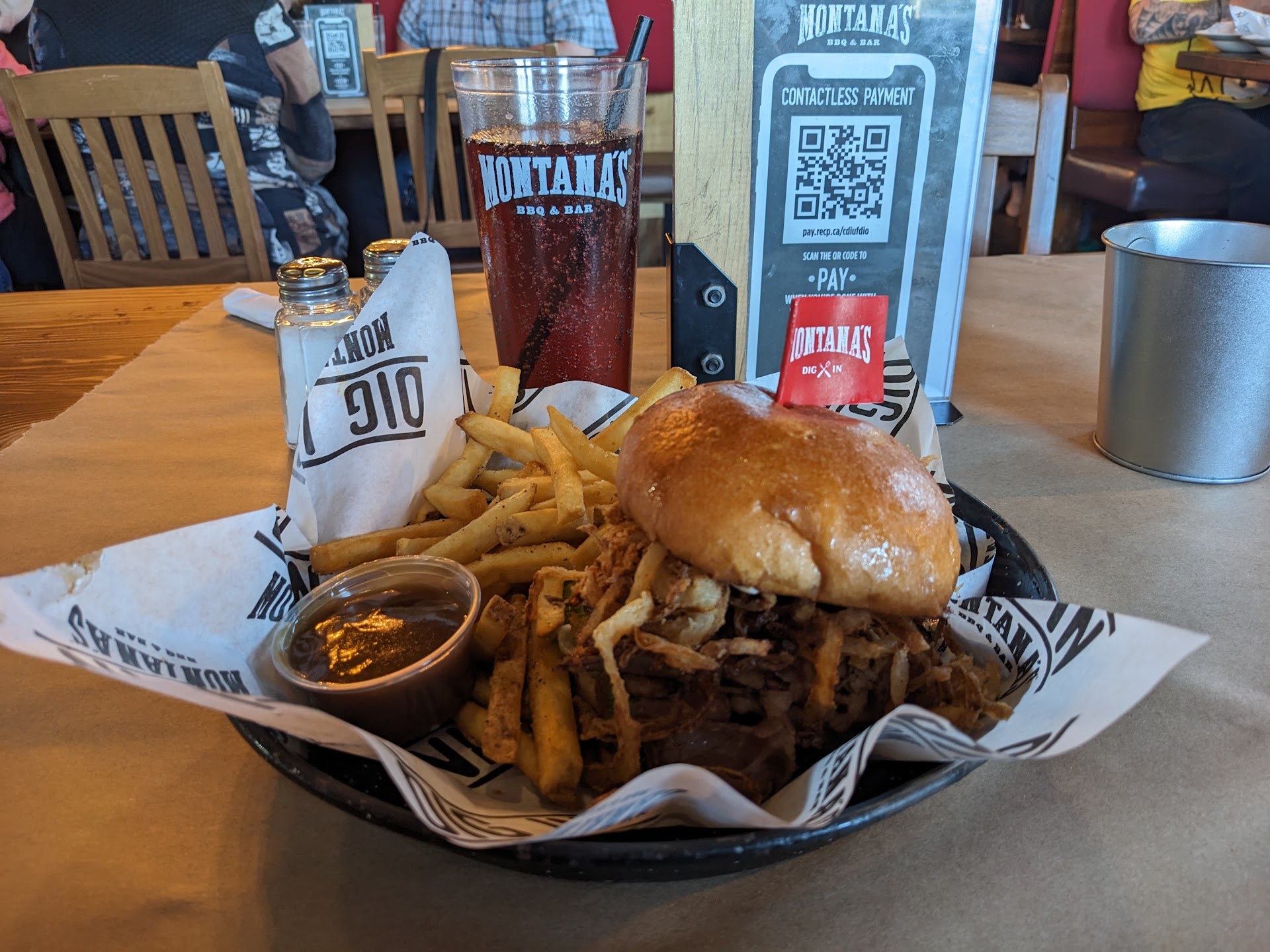 Read moreHaving been down for quite some time, I was offered the chance to go out for dinner and the decision was unanimous for Montanas. Having gone two other times and very much enjoyed ourselves, we knew implicitly we would enjoy ourselves again. My partner Jeremy got chicken strips and I got the Honkin' ribs and shrimp skewers combo. We also got a nachos appetizer with beef instead of pulled pork. And a side of corn and french fries! It was amazing and the meat was fantastic and soft and juicy, falling off the bone. The apple butter and honey garlic dressing made my mouth water and made my ribs even better, though it was hard to improve on an already perfect meal! We had a great time and I'd recommend Mama's Lemonade for a drink since it's delicious and the alcohol content is perfect for a hot day drink. All in all, a perfect day!