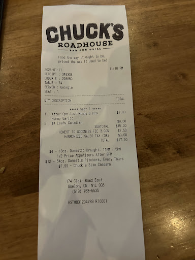 Read morechantal was amazing From the moment we walked through the doors, it was clear that we were in for an outstanding dining experience and much of that credit goes to our server, who truly went above and beyond in every way imaginable. Great service has the power to elevate even a simple meal into something memorable, and that’s exactly what happened. First and foremost, the warmth and attentiveness of the server stood out immediately. She greeted us with a genuine smile, offered a warm welcome, and made us feel valued from the start. she offered her personal recommendations, and explained the menu with insight and enthusiasm not in a rushed or rehearsed way, but with authenticity that felt both knowledgeable and personable. One of the best qualities a sever can have is their ability to read the table perfectly. Chantel struck the ideal balance between being attentive and giving us space. Our food arrived promptly, and any small request (like a sauce on the side or a dietary preference) was handled with ease and professionalism. Everything arrived exactly as requested, hot and beautifully presented. There were no reminders needed, no errors to correct, and not once did we have to flag her down for something we needed she always seemed to be one step ahead. She engaged us in conversation without overstepping, picked up on our sense of humor, creating a relaxed and fun atmosphere. It felt like we were being taken care of by someone who genuinely enjoys their job and cares about the people they serve. As we left, she thanked us with the same warmth and authenticity she had shown throughout the evening. We walked away feeling not only full and satisfied but genuinely impressed and grateful for the experience she helped create. Thanks to chucks and Chantel who gave us such a wonderful...