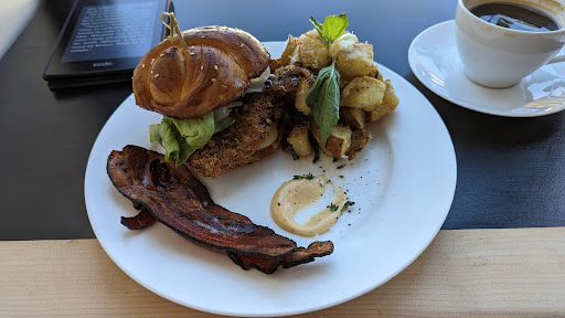 2nd and 3rd visits: breakfast again with the same friend both times. The Brekkie is great. My scrambled eggs were done to perfection. He asked for burnt eggs, and the cook actually sent them out on a plate by the server, to see if they were good enough. Awesome customer service for doing that, and the eggs were just what he likes. The sausage is tasty as sin, with whatever herbs it's made with. Tasty, buttery, almost crunchy toast with the crust cut off? Greens add a touch of health to the plate. LOL The two bacon strips are cooked perfectly flat, like a ruler, which I picked up and ate with my fingers. Excellent fresh home fries with parmesan with chunks of various sizes, just the right amount of greasiness. The Lucky Charms latte for St Paddy's was very fun with a few marshmallows on top, and great tasting drink itself without being too sweet. The only thing I find is that the atmosphere is a bit loud bc the high ceiling echo I guess?