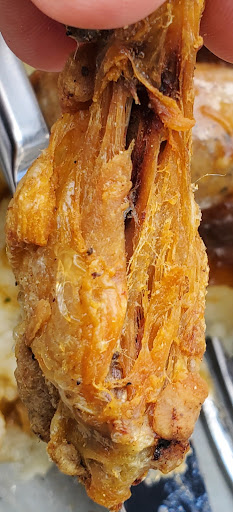 Worst was the wings. The dryest, most shrunken and worst wings I have ever been served. I'm suprised they let them out of the kitchen. The picture I included does not has not been bitten, its just so old and dry that it is disintegrating. I dont think they where cooked today. The sauses where great and full of flavor.