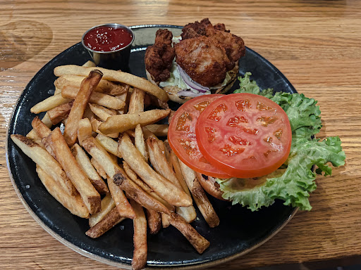 Generous portions of food, but the risotto bed for the haddock was way over garlicky and was a pretty mushy risotto, even for risotto. The haddock had a "pea" crust in a very unappetizing yellow colour and was dry. Our winter salad, when asking came with no greens and was to be a warm winter squash salad... it came heaped with greens and mine with barely any squash!