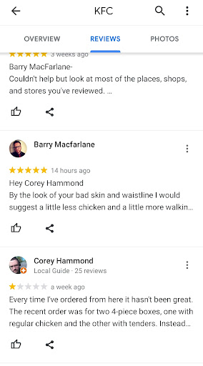 Read moreI think it's worth noting that this reviewer going by the name of "Barry Macfarlane" is actually one of the employees (Scott) at this location using the identity of a customer (whom I know personally) who left a review on here ages ago. I think this speaks volumes of the quality of service, or lack there of, you're likely to receive at this particular location; Scott is routinely rude and demeaning towards his customers, both online and in-store. As a manager myself, this type of pathetic, self absorbed and downright petty display would result in immediate termination. For an employee to take it upon themselves to lash out at customers leaving honest feedback which could potentially help the establishment improve and grow is entirely unprofessional, damages the company's image and mission, and hurts the chances of customers returning, resulting in a decline in sales. And then to impersonate a customer and leave comments on their behalf? That's just downright bizarre. Scott clearly does not care about his position within the company as his attitude continuously displays, and is therefore a liability within the KFC family. Either he shapes up or it's time to bring in someone who hasn't lost their head...